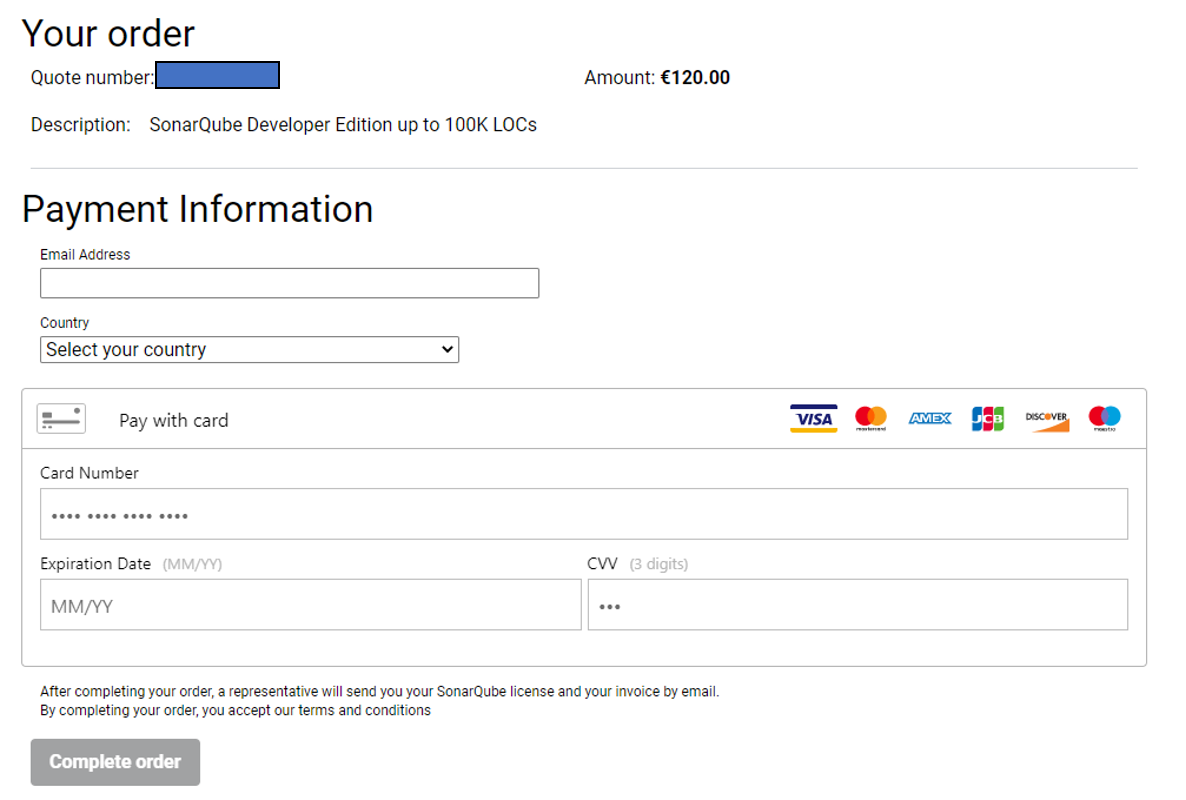 이렇게 1, 2, 3번 항목을 기입하고 SonarQube팀에게 메일을 보내주면 답신으로 payment 링크가 나옵니다.
