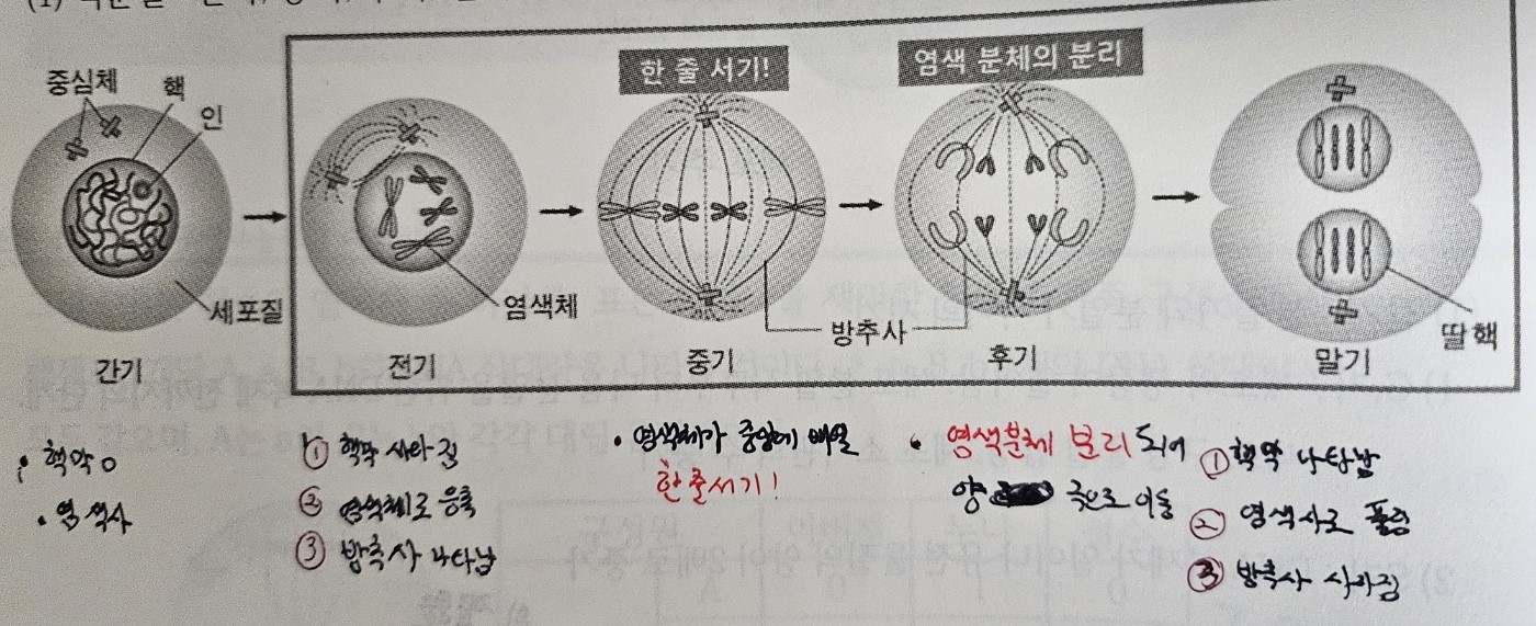- 중기: 염색체가 중앙에 배열되어 한줄서기함