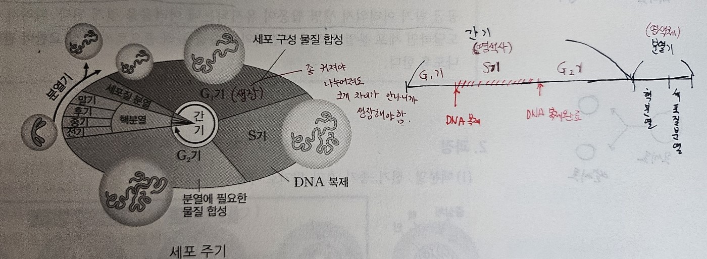 - 간기(DNA 복제와 세포 생장) + 분열기(세포 분열)