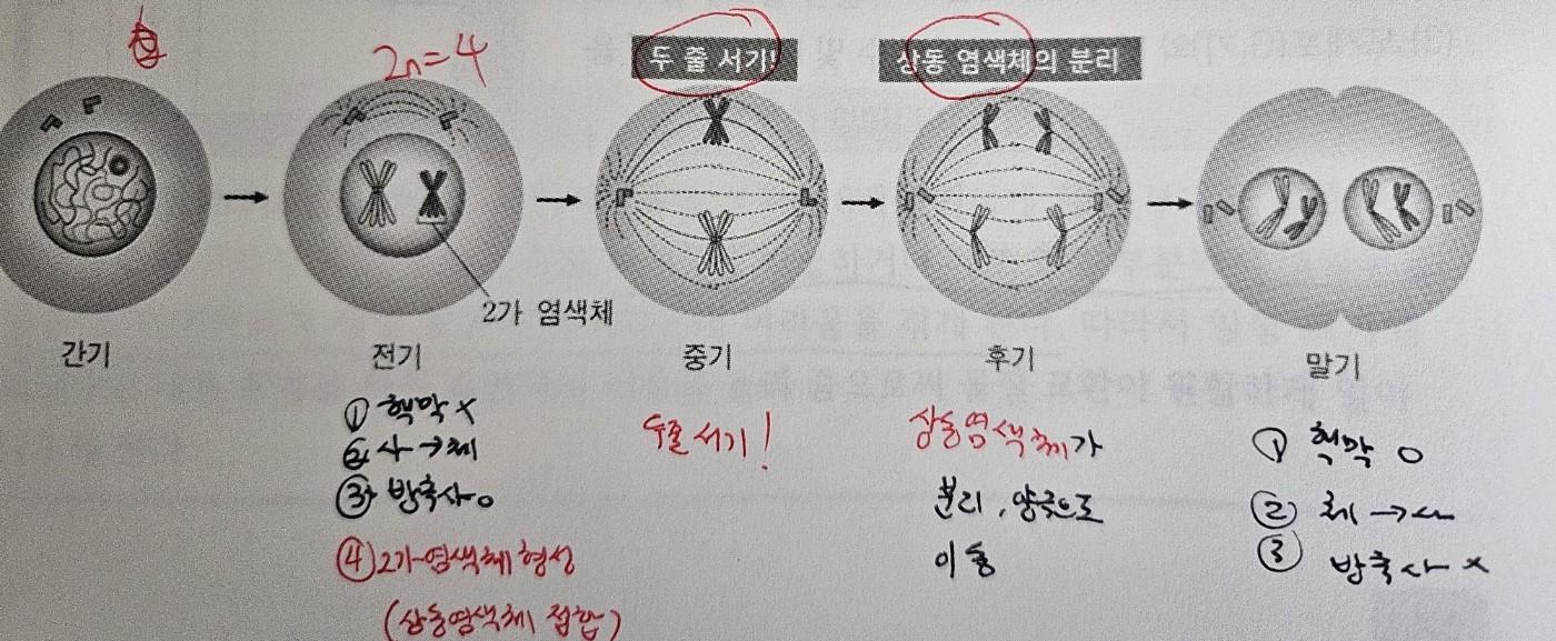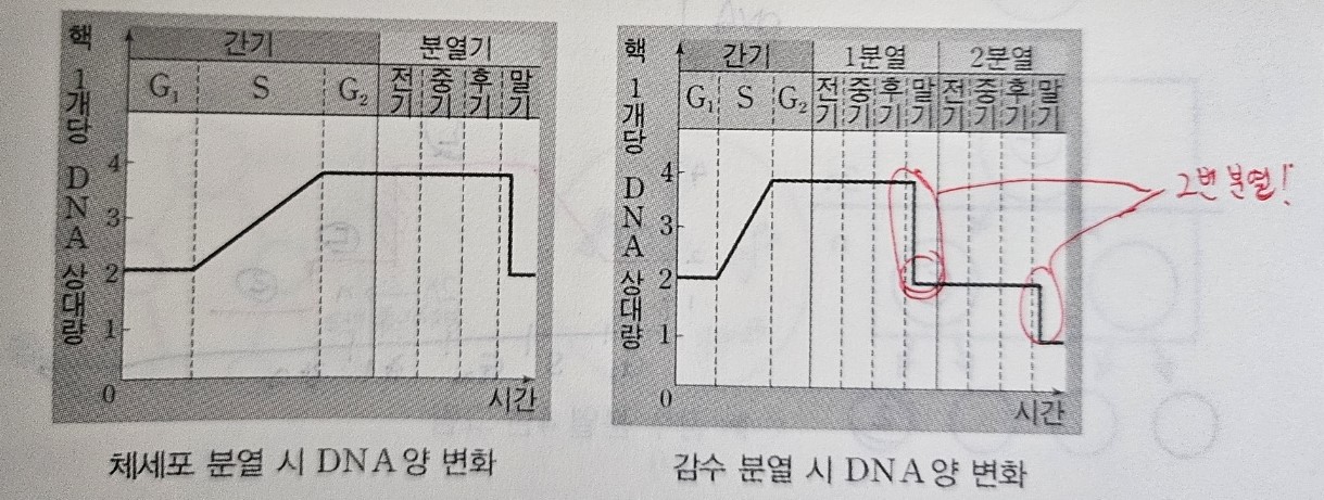 딸세포의 염색체 수와 DNA양은 모세포(G1기)의 절반