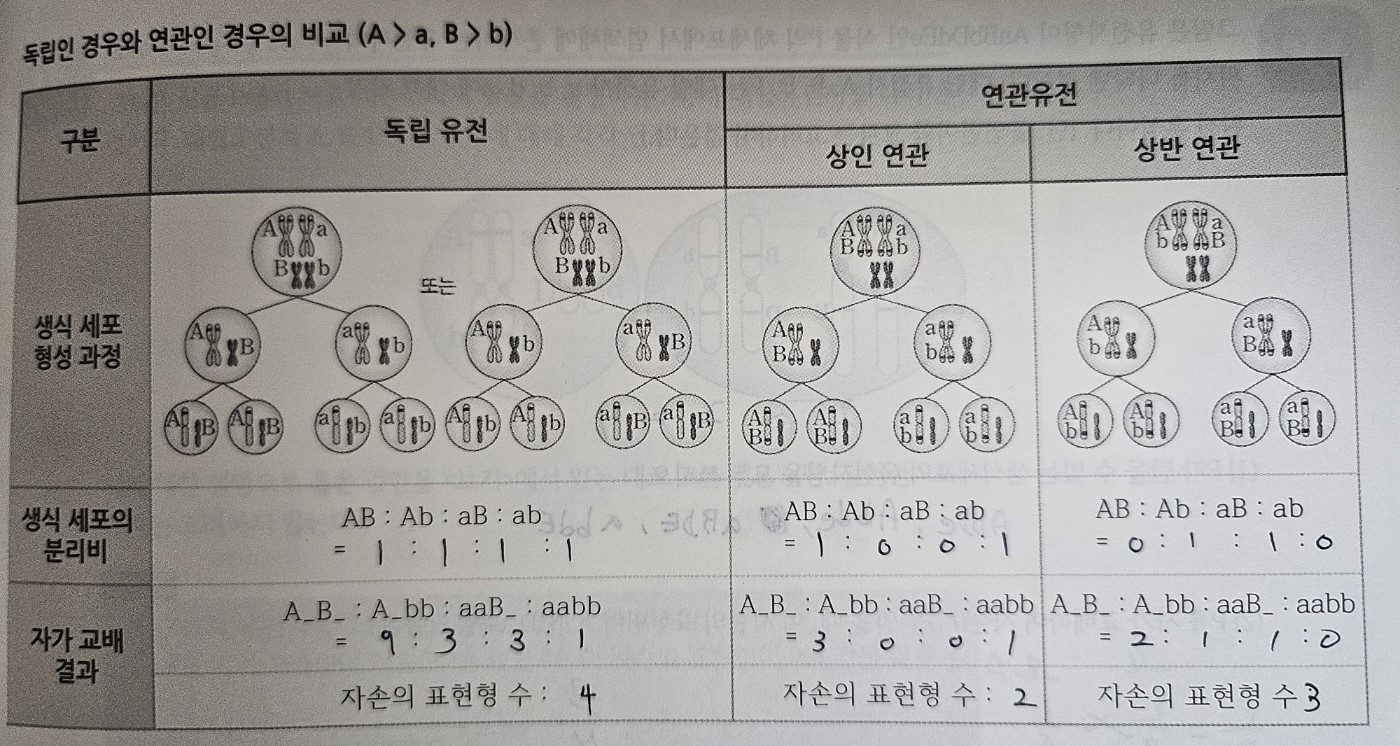 - 연관 유전: 여러 유전자들이 동일한 염색체에 위치. 생식 세포 분열 시 함께 행동 (독립의 법칙이 성립되지 않음)