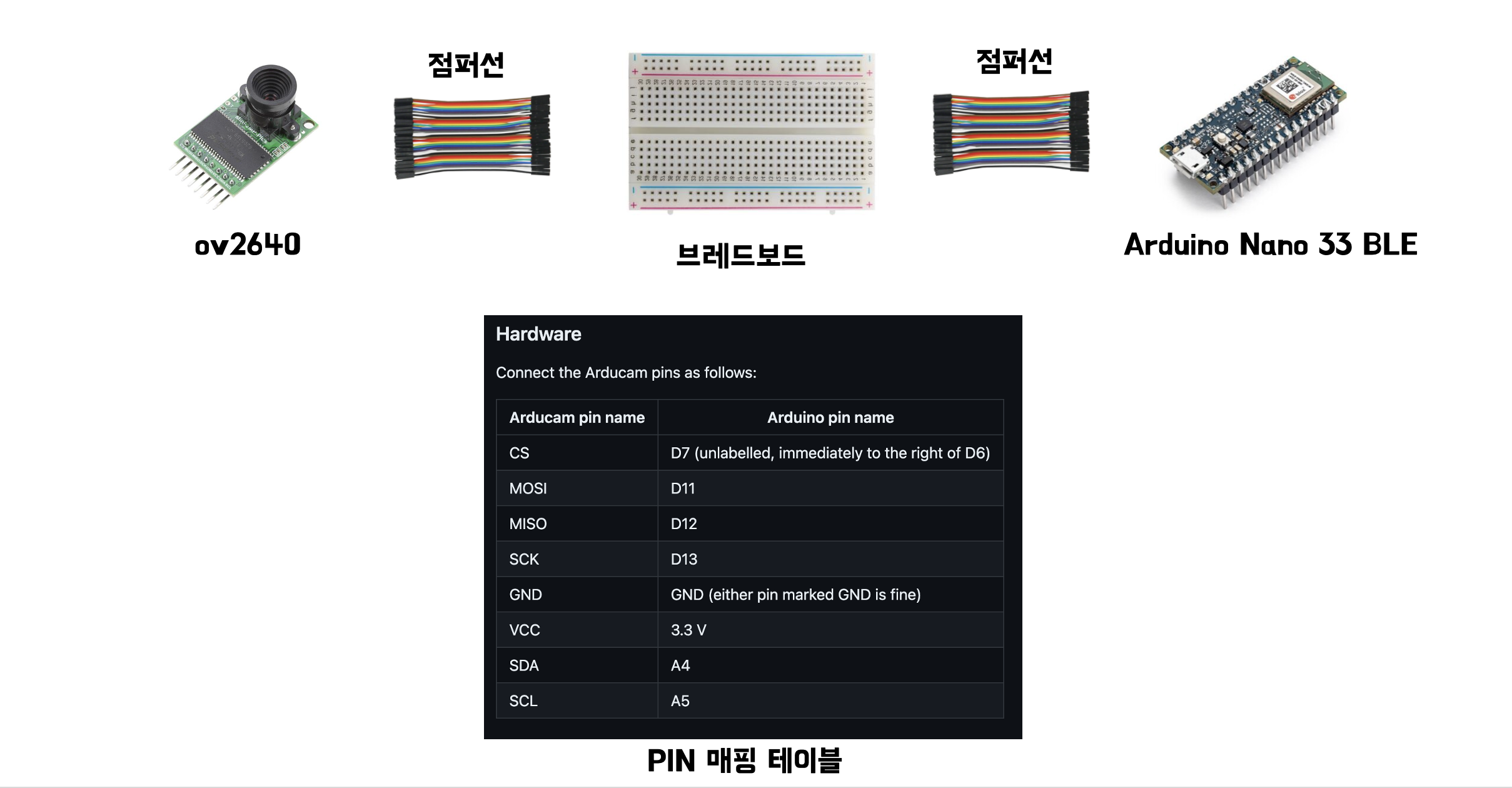 OV2640의 Pin 번호와 Nano 33 BLE의 Pin 번호를 매핑하기 위해 점퍼선과 빵판을 사용했다.